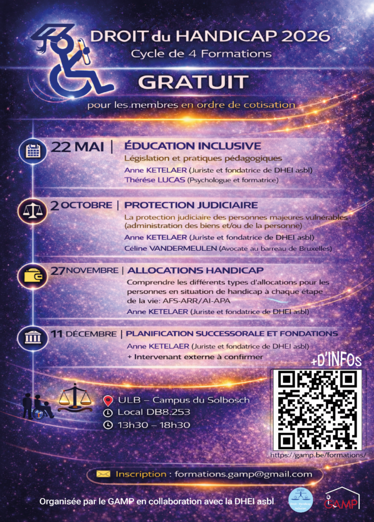 đ En 2026, DHEI dispensera 4 formations en collaboration et avec le soutien du GAMP Ă destination des parents, aidant.e.s proches, personnes en situation de handicap et professionnel.le.s du secteur.